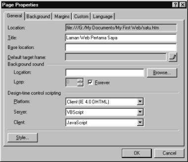 Terdapat menu General, Background, Margins, Custom dan Language. Perhatikan dalam General dahulu. Di situ, terdapat Location. Ia akan menyatakan di mana fail anda itu diletakkan dalam cakera keras. Kemudian - Title. Seperti yang anda ketahui sebelum ini, title adalah tajuk kepada fail HTML anda itu. Ia akan dipaparkan di penjuru kiri di bahagian atas sekali. Tukar title dari Hai kepada Laman Web Pertama Saya.
