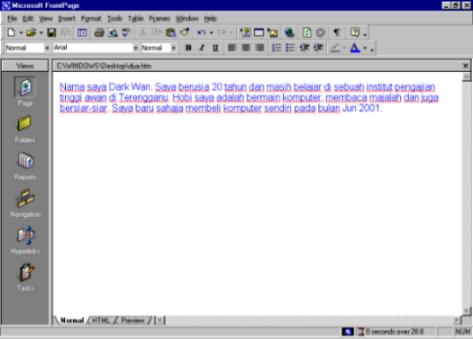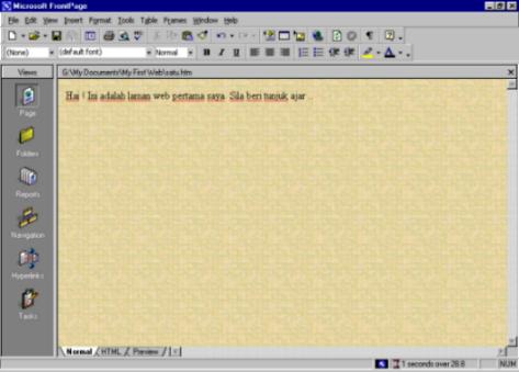 Anda telah kenal Frontpage, sudahpun membuat laman web paling ringkas dengan Frontpage dan kini ialah masa untuk mendalamkan lagi pengetahuan anda itu. Sekarang, buka kembali fail satu.htm.