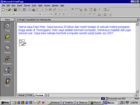 Kemudian, tempatkan cursor anda di baris baru selepas ayat terakhir dalam fail dua.htm. Kemudian, pergi ke bar menu, pilih Insert > Picture > From File dan pergi ke folder Imej tadi dan klik pada fail gambar anda. Gambar itu akan dimasukkan ke dalam laman web anda. Klik pada Preview. Laman web anda akan kelihatan seperti ini..