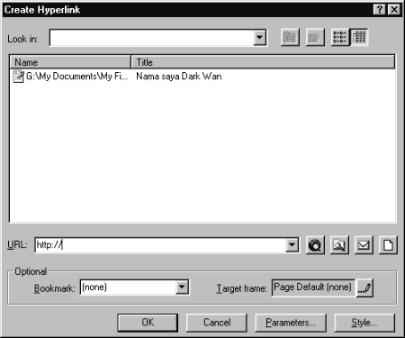 Buka fail dua.htm. Kemudian, tandakan nama Dark Wan. Klik kanan dan anda akan pilih Hyperlink.Jika anda tidak nampak menu ini dan ternampak menu lain, pergi pula ke bar menu dan pilih Insert > Hyperlink. Di sebelah tulisan URL, terdapat kotak kosong. Isikan ia dengan alamat ini : www.geocities.com/the_darkwan. Klik OK dan simpan fail ini sebagai dua.htm. Jika komputer anda sedang mempunyai sambungan Internet, uji laman tersebut dengan menggunakan Internet Explorer. Klik pada nama Dark Wan dan anda akan lihat yang ia akan menyambungkan terus ke laman web Dark Wan.