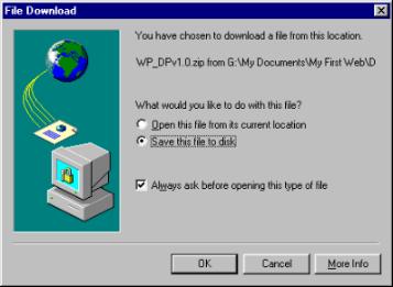 Cara yang sama juga digunakan sepertimana anda ingin menghubungkan sesuatu laman ke laman yang lain, tetapi bezanya ialah, fail itu bukannya fail HTML, JPG, TXT atau apa-apa fail yang boleh dipaparkan di Internet Explorer. Sebagai contoh, fail ZIP. Jadi, bila pengunjung mengklik ayat yang mengandungi pautan ke fail tersebut, kotak Download akan muncul.
