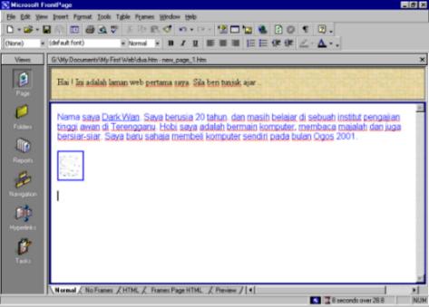 Klik bingkai bahagian atas dan klik Set Initial Page. Jadikan fail satu.htm pada bahagian atas dan fail dua.htm pada bahagian bingkai bawah. Laman anda akan kelihatan seperti ini.