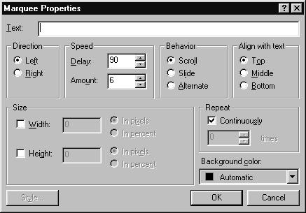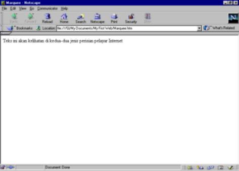 Masukkan teks - nyatakan arah ke mana anda mahu teks itu bergerak, kelajuan teks itu bergerak, warna latar belakang, dan lain-lain yang terdapat di dalam menu tersebut. Ingat ! Tulisan yang dihasilkan ini adakalanya tidak kelihatan jika dipaparkan dengan menggunakan Netscape Navigator.