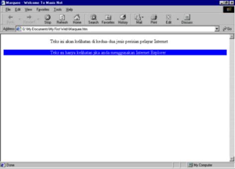 Ubah background color menjadi warna biru. Tukar warna font dari hitam ke warna putih. Kemudian, simpan fail ini sebagai Marquee.htm. Buka fail ini menggunakan Internet Explorer. Anda akan lihat hasilnya begini ;