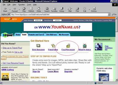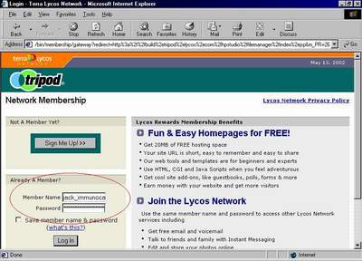 Pertama sekali, anda perlulah mendaftar akaun anda di http://www.tripod.com. Nama akaun anda akan menjadi sebahagian daripada URL anda, sebagai contoh, akaun jack_immunocal. Jadi, 'URL'nya ialah http://jack_immunocal.tripod.com.